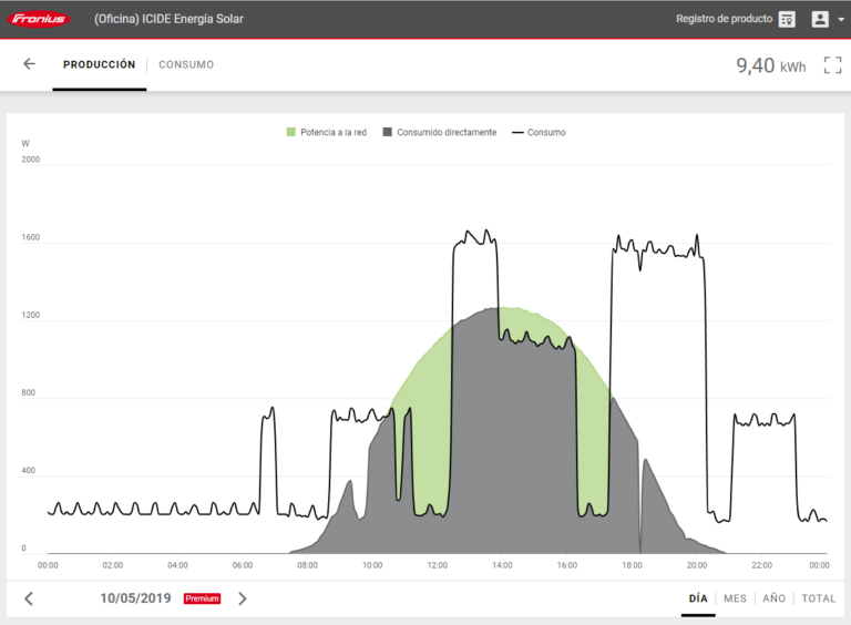 En la gráfica incluida en la monitorización de los inversores FRONIUS podemos observar como consumimos de forma instantánea la energía generada por nuestra instalación (De color GRIS). Toda esta energía autoproducida es energía que dejamos de comprar a la empresa suministradora.