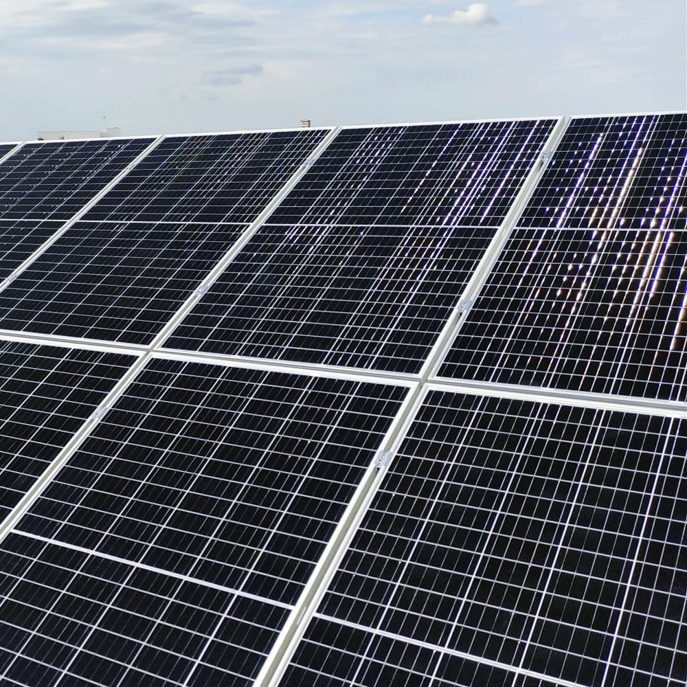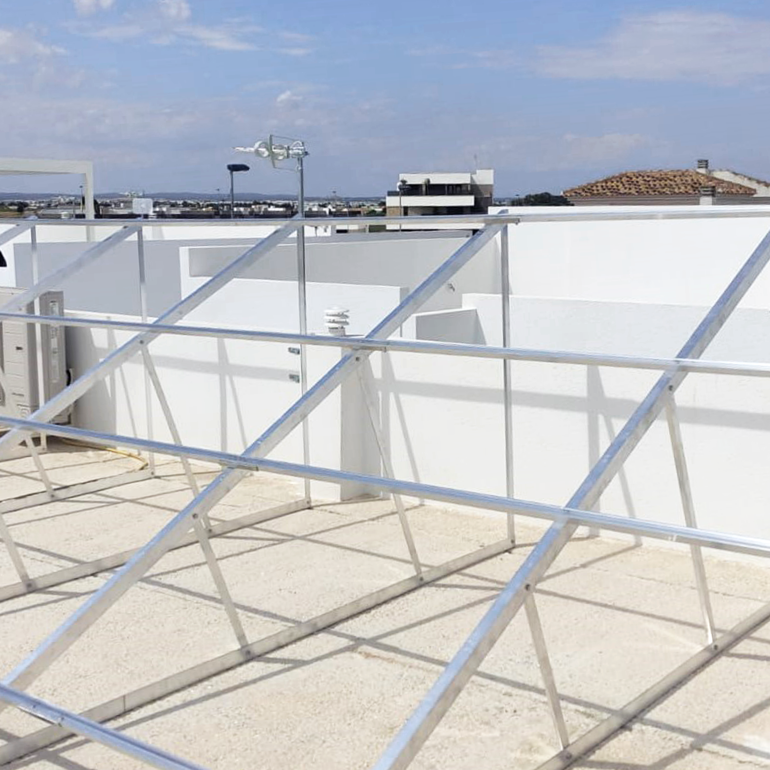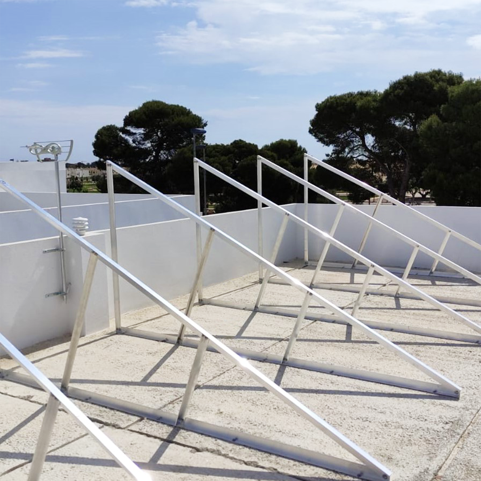 Nuestra última instalación la hemos realizado en una vivienda unifamiliar en Santiago de la Ribera (Murcia). Nuestro cliente necesitaba una instalación conectada a red para su casa en planta baja. Al tratarse de una cubierta plana con mucho espacio disponible, optamos por diseñar y montar una estructura personalizada para 18 paneles solares, de forma que pudiéramos conseguir la mejor orientación y la inclinación óptima. Montamos los paneles solares de 405Wp de Jinko Solar, una de las mejores marcas del sector, que ofrece hasta 25 años de garantía de rendimiento, obteniendo así un total de 7290Wp de potencia. Como podéis ver, nuestras estructuras se fabrican a medida de cada instalación en aluminio especial ultra-resistente y tienen una garantía de diez años.